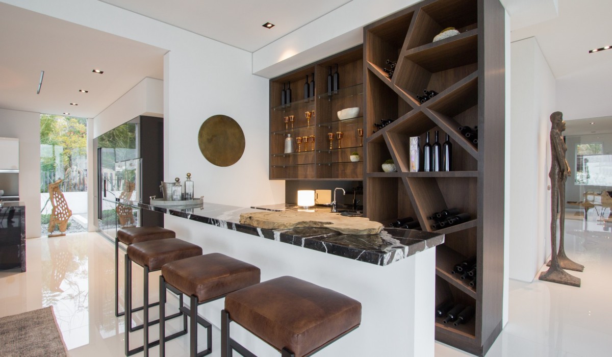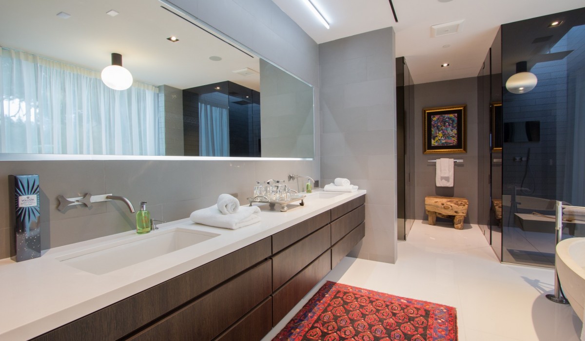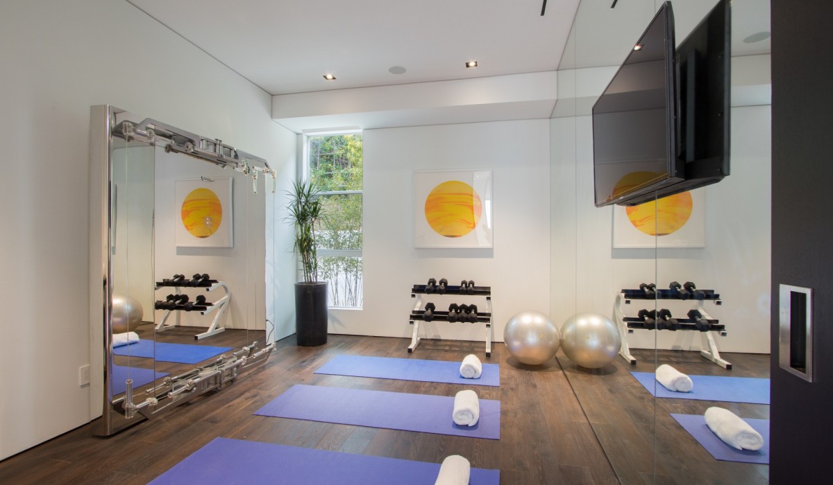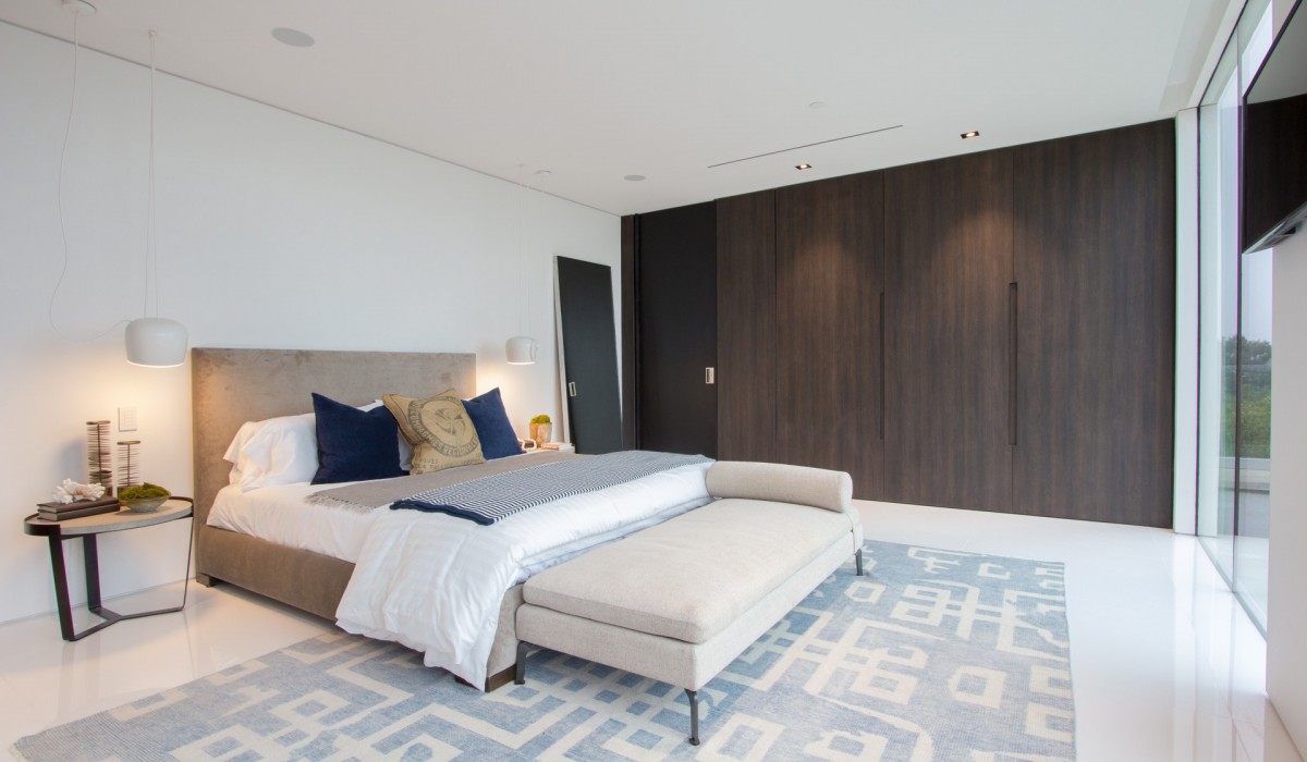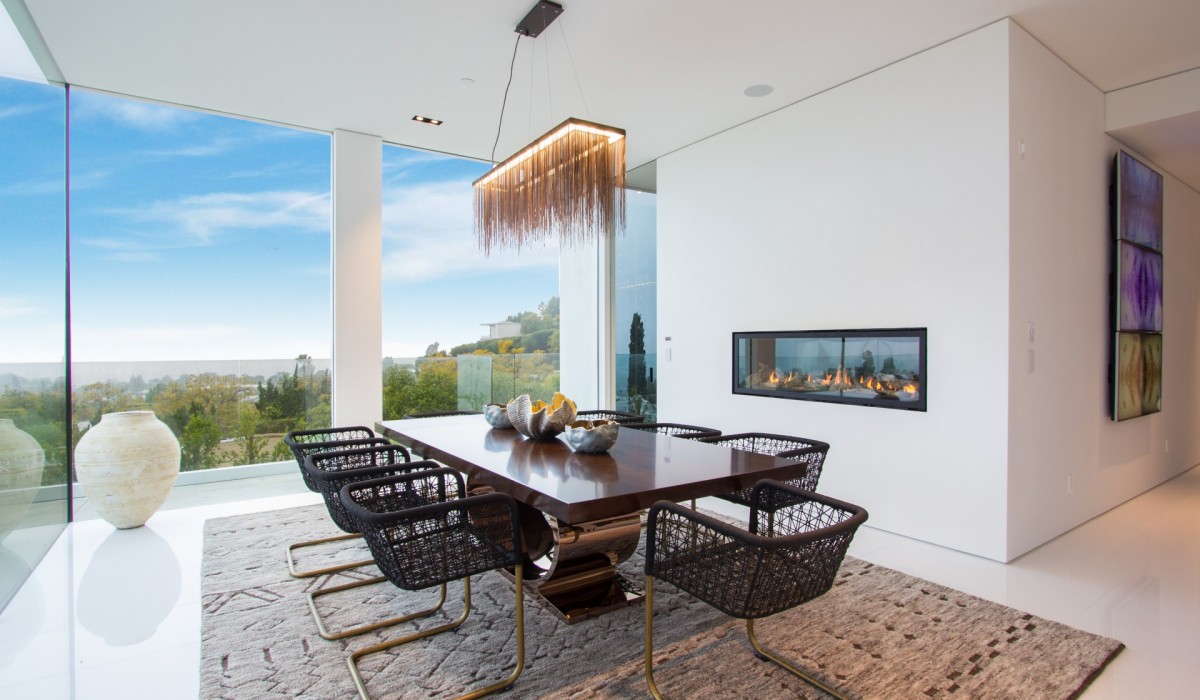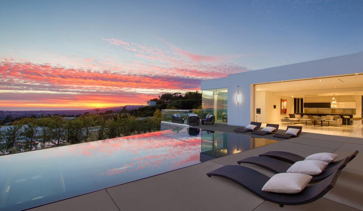 Trousdale Estates location for a premier Contemporary Estate featuring sublime City and Ocean views endlessly stretching to the horizon. Private gated Motorcourt leads to impressive Entry where Black Antolini marble walls wrap seamlessly from exterior to inside. Superb volume is achieved with soaring ceiling height in all rooms. Electric sliding glass doors open 50′ breathtakingly merging interior and Pool Pavilion into a continuous entertaining space– a virtual indoor/outdoor experience. Single Level living is a rarified amenity presented luxuriously here. 5 bedroom suites include a Guest Apartment and the Grand Suite bedroom– an unforgettable domain of its own with Kitchenette and private reflecting pool. Other rooms include Theatre, Office with bath, TechnoGym, Display Kit plus Prep Kit, temp controlled Wine Room and dual Powder Room displaying custom wall by noted San Francisco artist. An ultimate California lifestyle can be enjoyed here, surrounded by cutting-edge design and rare luxuries.
